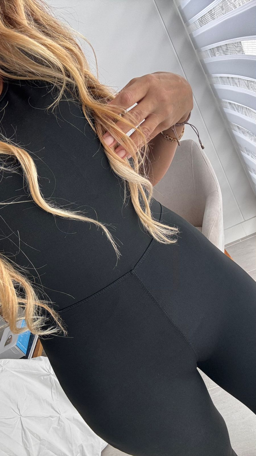 Este enterizo negro de mangas es la prenda perfecta para quienes aman verse bien sin sacrificar comodidad. Confeccionado en una tela suave, ajustable y elástica, se adapta a tallas entre la 8 y la 14, realzando tu figura de forma natural.