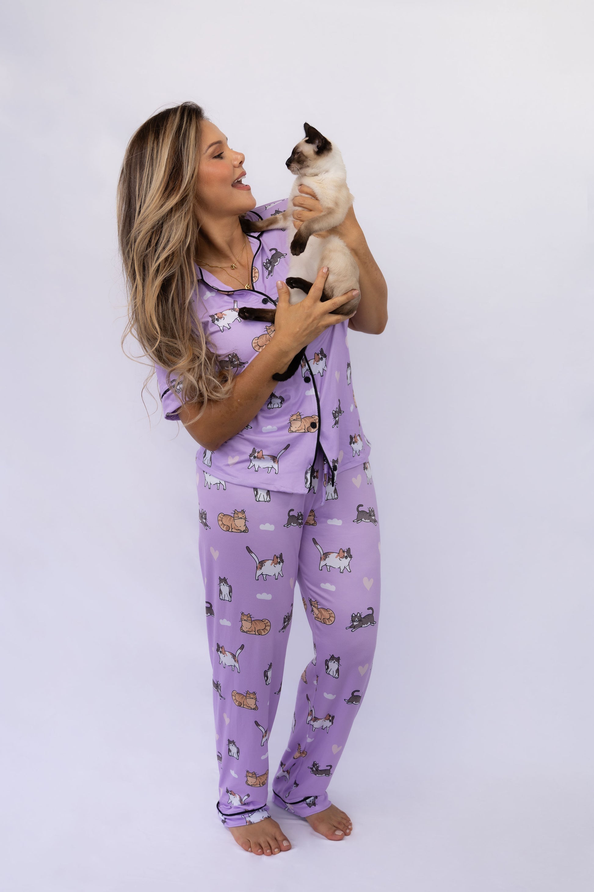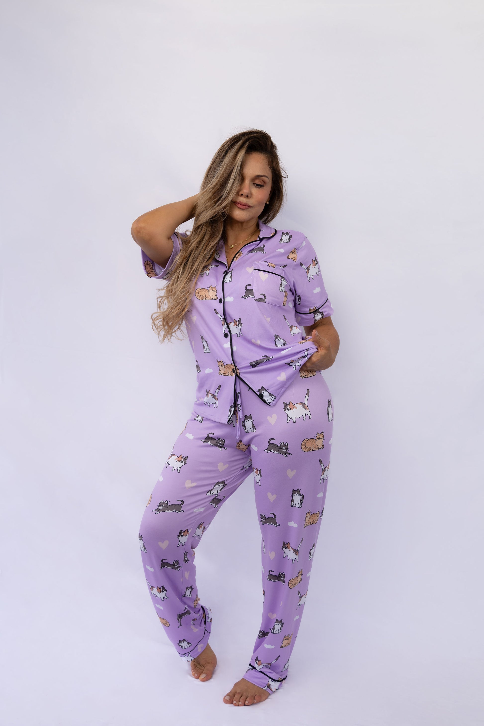 Descubre la pijama Gatitos Miau Pijama, perfecta para las amantes de los michis. 🐱💕 Con su tela suave y fresca de piel de durazno de alta calidad, camisa de manga corta con botones y bolsillo, y pantalón ajustado con lazo decorativo, te envolverá en un mundo de comodidad y ternura para noches inolvidables de ronroneo. 🍑✨🎀😴 Hecho en Colombia.